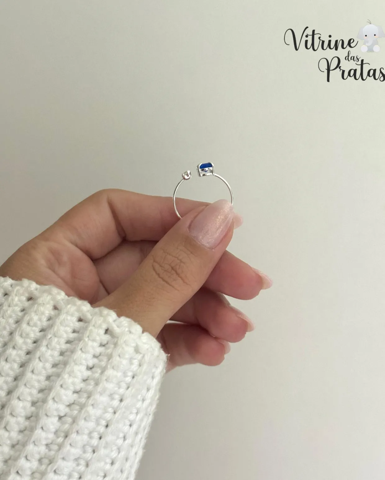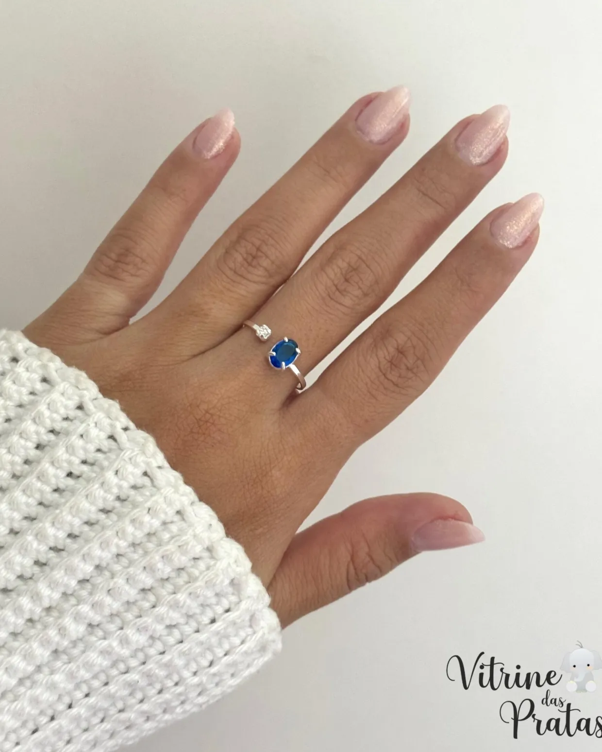 Anel regulável com zircônias grande e pequena. Azul Safira