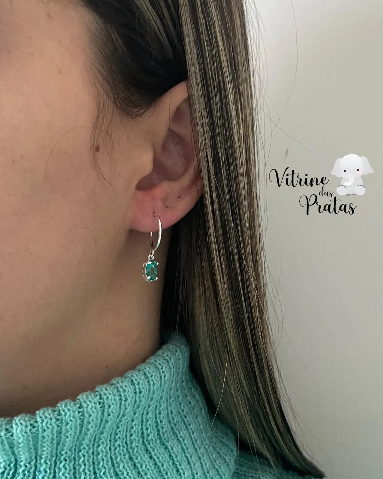 Argola de tarraxa com pingente de zircônia oval verde.